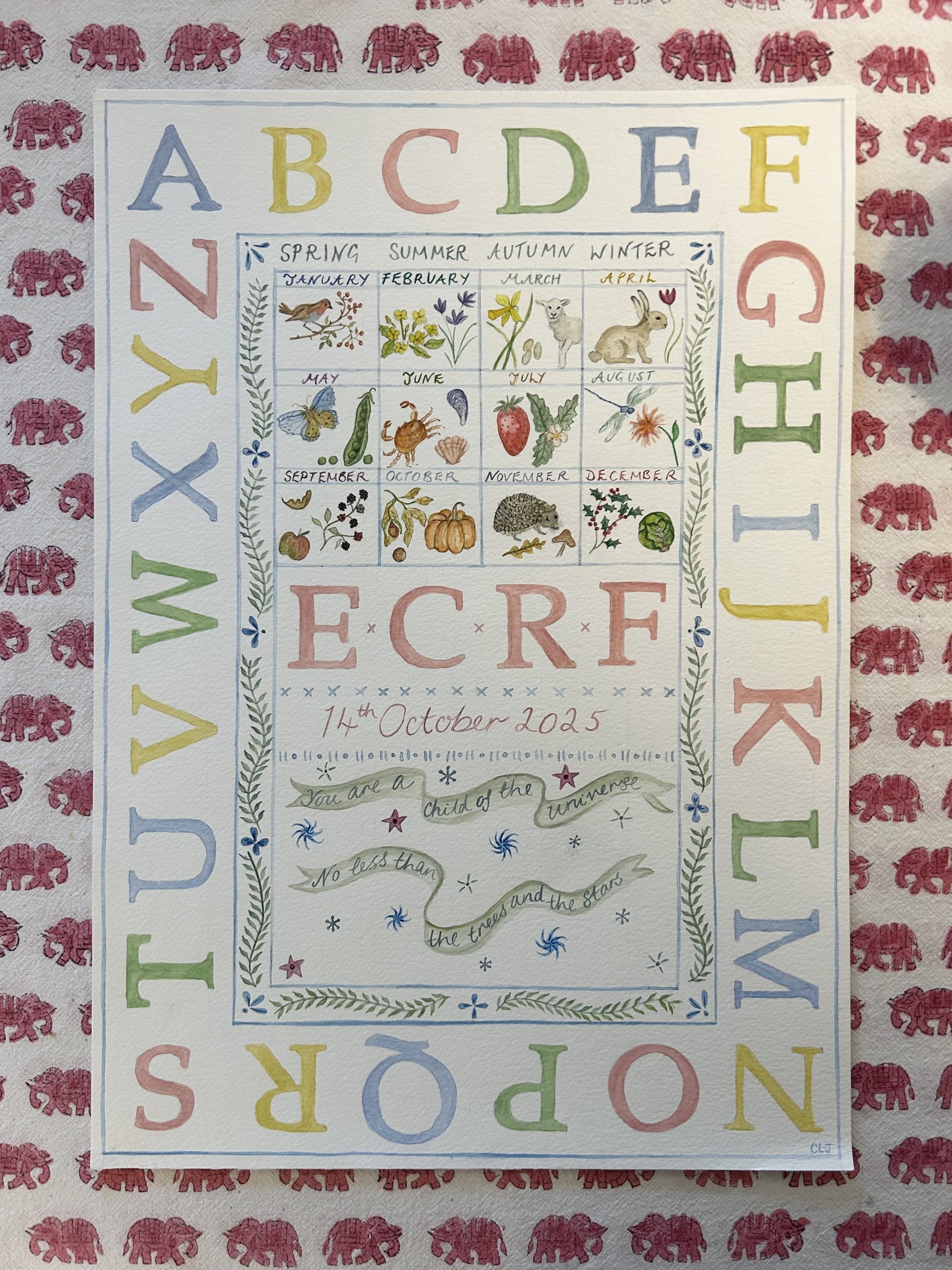 Based on a traditional Victorian sampler, this colourful watercolour print is a special and original gift for a baby or child. It features the alphabet, a calendar of sweet little seasonal images and a quote from the poem Desiderata: "You are a child of the universe, no less than the trees and the stars".